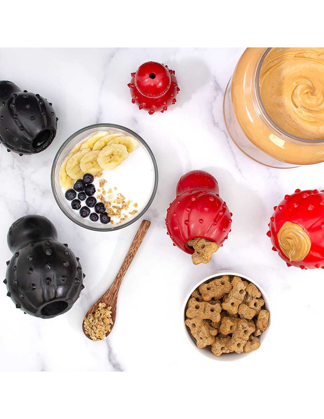 Este juguete 3 en 1 es la solución perfecta: puedes rellenarlo con snacks o congelarlo para un desafío más duradero y dejar que lo mastique mientras limpia sus dientes gracias a sus protuberancias dentales.